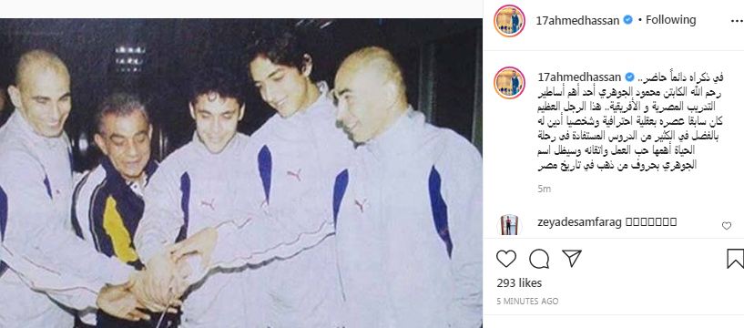 أحيا أحمد حسن نجم النادي الأهلى ومنتخب مصر الأسبق ، الذكرى الثامنة لرحيل الجنرال محمود الجوهرى، المدير الفنى الأسبق للمنتخب المصرى ، ونشر صورة نادرة تجمعهما بالتؤام حسام وإبراهيم حسن وأحمد حسام ميدو عبر حسابه بموقع "انستجرام"، معلقا عليها :" في ذكراه دائماً حاضر.. رحم الله الكابتن محمود الجوهري أحد أهم أساطير التدريب المصرية و الأفريقية.. هذا الرجل العظيم كان سابقا عصره بعقلية احترافية وشخصيا أدين له بالفضل في الكثير من الدروس المستفادة فى رحلة الحياة أهمها حب العمل واتقانه وسيظل اسم الجوهري بحروف من ذهب في تاريخ مصر".