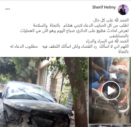 تعرض نجل الفنان شريف حلمي لحادث سير على الدائري، ونقل إلى أثرها إلى المستشفى لتلاقي العلاج، حيث كتب شريف حلمي، عبر حسابه الشخصي على "فيس بوك"، اليوم الأربعاء: "الحمد لله على كل حال، أطلب من كل الحبايب الدعاء لابني هشام بالنجاة والسلامة، تعرض لحادث فظيع على الدائري صباح اليوم، وهو الآن في العمليات بالمستشفى".