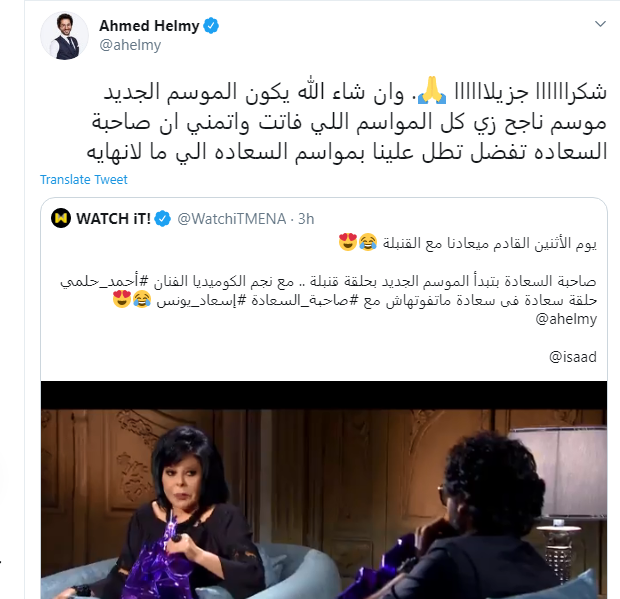نوه النجم أحمد حلمي إلى حلقته مع إسعاد يونس في برنامج "صاحبة السعادة" يوم الاثنين المقبل، وذلك من خلال حسابه الرسمي على موقع تويتر، حيث علق على برومو حلقة استضافته، قائلا موجها رسالته لإسعاد يونس: "شكرا جزيلا، وإن شاء الله يكون الموسم الجديد موسم ناجح زي كل المواسم اللي فاتت وأتمني إن صاحبة السعاده تفضل تطل علينا بمواسم السعادة إلى ما لا نهاية".