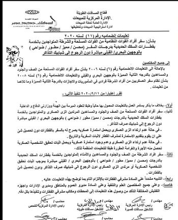 أصدرت هيئة السكة الحديد منشورًا رسميًا لإدارات المبيعات والتفتيش والمحطات ومشرفو القطارات يتيح لأفراد الجيش والشرطة باستقلال القطارات العادية بأنواعها بموجب الزى العسكرى أو بطاقة إثبات الشخصية العسكرية أو استمارة السفر دون الرجوع إلى شبابيك صرف التذاكر.