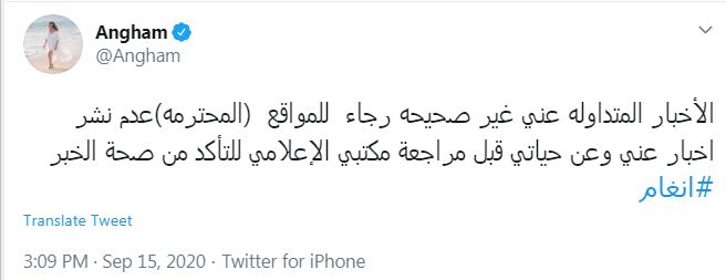 عبرت النجمة أنغام عن غضبها من الأخبار المتداولة بالفترة الأخيرة عن حياتها الشخصية، وكتبت عبر حسابها بموقع "تويتر": "الأخبار المتداولة عنى غير صحيحة رجاء للمواقع (المحترمة)عدم نشر اخبار عني وعن حياتي قبل مراجعة مكتبي الإعلامي للتأكد من صحة الخبر".