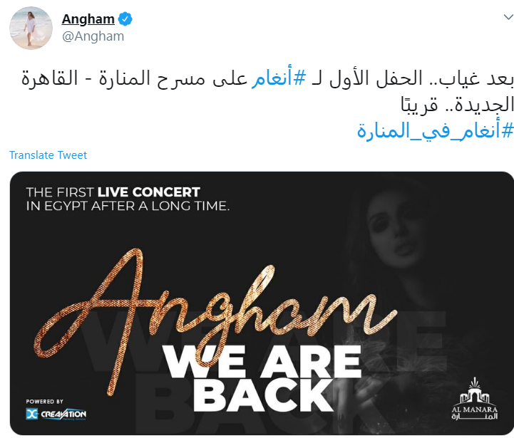 وقال الحساب الرسمى لأنغام عبر تويتر :"بعد غياب.. الحفل الأول لأنغام على مسرح المنارة - القاهرة الجديدة.. قريبًا".