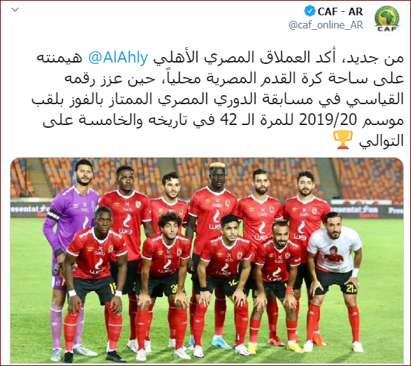وكتب الكاف، عبر حسابه على تويتر، "من جديد، أكد العملاق المصرى الأهلى هيمنته على ساحة كرة القدم المصرية محلياً، حين عزز رقمه القياسي فى مسابقة الدورى المصرى الممتاز بالفوز بلقب موسم 2019/20 للمرة الـ 42 فى تاريخه والخامسة على التوالى".