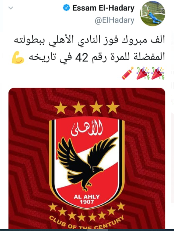 وكتب الحضرى عبر صفحته الرسمية على تويتر: "ألف مبروك فوز الأهلى ببطولته المفضلة، للمرة رقم 42 فى تاريخه.