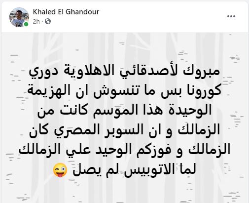 وجه خالد الغندور، نجم الزمالك السابق، رسالة إلى الأهلاوية بعد فوز المارد الأحمر بلقب الدورى للمرة الـ42 فى تاريخه، وكتب عبر حسابه على موقع "فيس بوك"، "مبروك لأصدقائي الأهلاوية دورى كورونا بس ما تنسوش إن الهزيمة الوحيدة هذا الموسم كانت من الزمالك، وإن السوبر المصرى كان الزمالك، وفوزكم الوحيد على الزمالك لما الأتوبيس لم يصل".