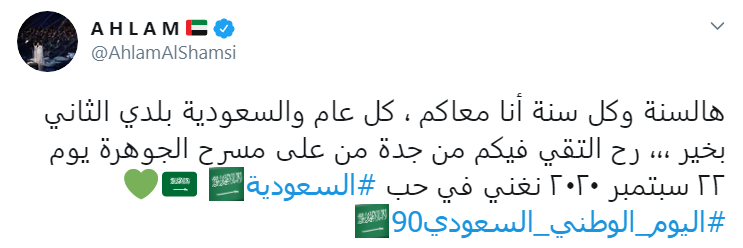 تستعد الفنانة أحلام، لإحياء حفل غنائى كبير فى المملكة العربية السعودية، يوم الثلاثاء 22 سبتمبر، على مسرح بجدة، للاحتفاء باليوم الوطنى السعودى.وقالت الفنانة أحلام فى تغريدة عبر حسابها الرسمى بتويتر :"هالسنة وكل سنة أنا معاكم ، كل عام والسعودية بلدي الثاني بخير... رح التقي فيكم من جدة من على مسرح الجوهرة يوم ٢٢ سبتمبر ٢٠٢٠ نغني في حب السعودية".