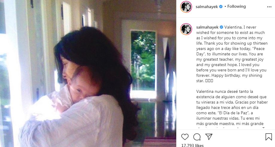 احتفلت النجمة العالمية سلمى حايك بعيد ميلاد ابنتها فالنتينا، ونشرت صورة لها مع طفلتها، عبر حسابها موقع "إنستجرام"، معلقة :"لم أرغب أبدًا فى وجود شخص ما بقدر ما تمنيت أن تدخل حياتى.. نشكرك على حضورك قبل ثلاثة عشر عامًا فى يوم مثل اليوم .."يوم السلام" لإلقاء الضوء على حياتنا.. أنت أعظم معلم لى، أعظم فرح وأعظم أملي. أحببتك قبل ولادتك وسأحبك إلى الأبد. عيد ميلاد سعيد يا نجمي الساطع".