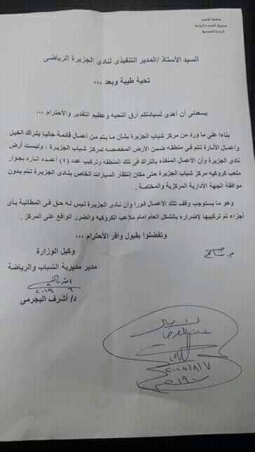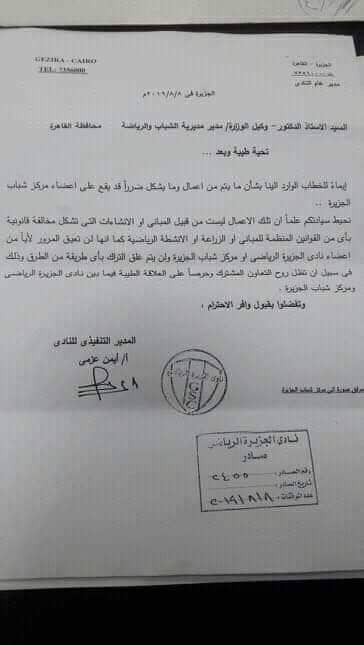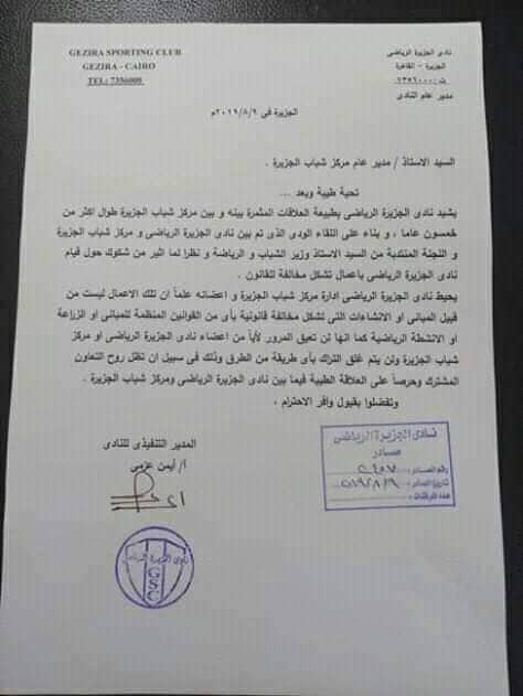 بعد وقفة اعضاء مركز شباب الحزيرة والذي يضم الآن أكثر من 250 الف عضو يجدون مذكرة واردة من رئيس نادي الجزيرة الرياضي وبها الآتي في مذكرة وردت في البداية بتاريخ 2019/8/8 الي مدير مديرية الشباب والرياضة بالقاهره وتم إرسالها ايضا الي رئيس مركز شباب الجزيزه في اليوم التالي بتاريخ 2019/8/9 وهي كالآتي :