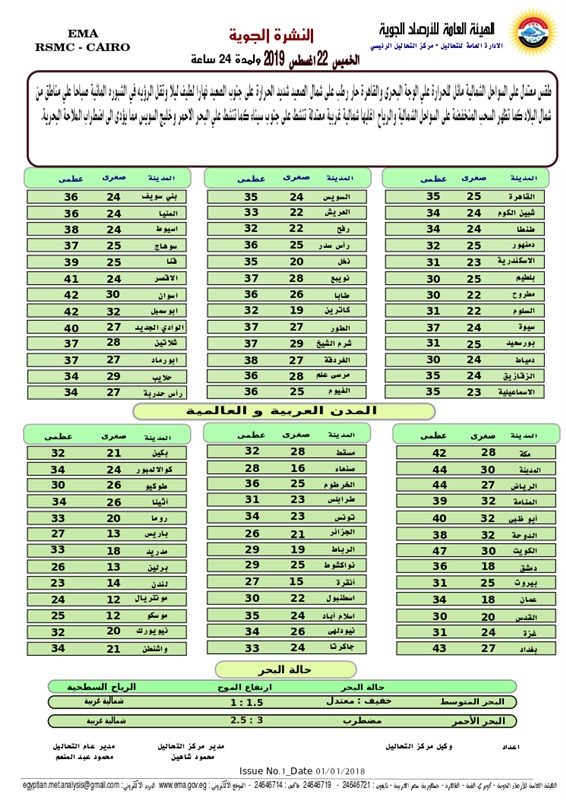 وتوقعت الهيئة ظهور السحب المنخفضة على السواحل الشمالية، وأن تكون الرياح معتدلة وتنشط على خليج السويس والبحر الأحمر، ما يؤدى إلى اضطراب حركة الملاحة بهما، كما تنشط على جنوب سيناء.
