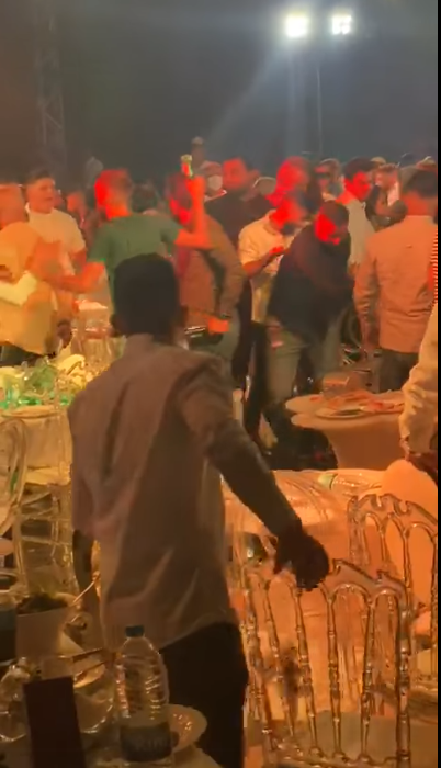 وظهر في الفيديوهات التي التقطت من داخل الحفل عدد من الحاضرين وهم يهشمون المقاعد في الحفل وسط هروب باقي الجهور من ساحة الحفل بعد إصابتهم بعد أن تم تراشق بعض المحتويات بين المشاغبين في ظل عدم وجود أفراد الأمن.