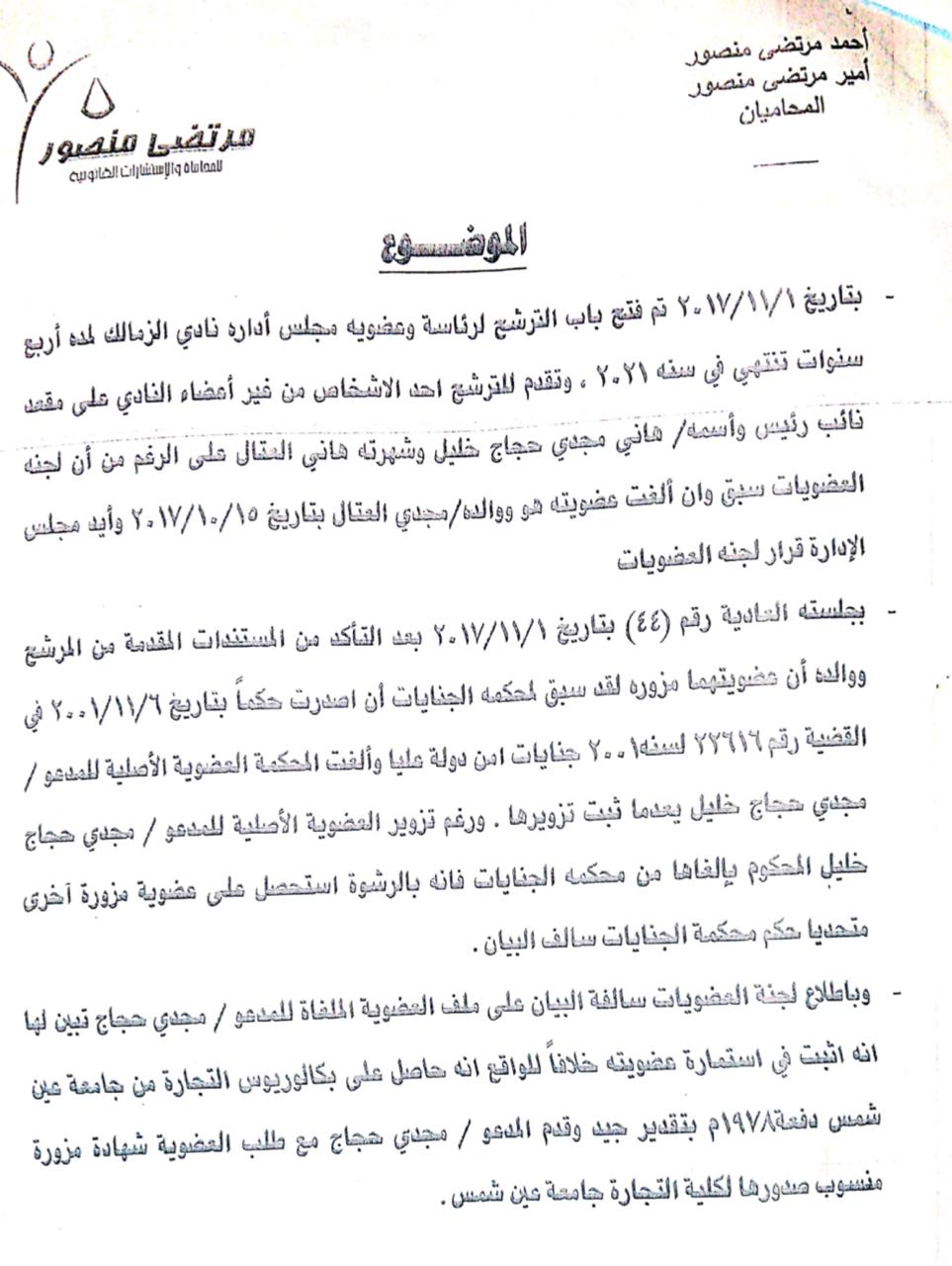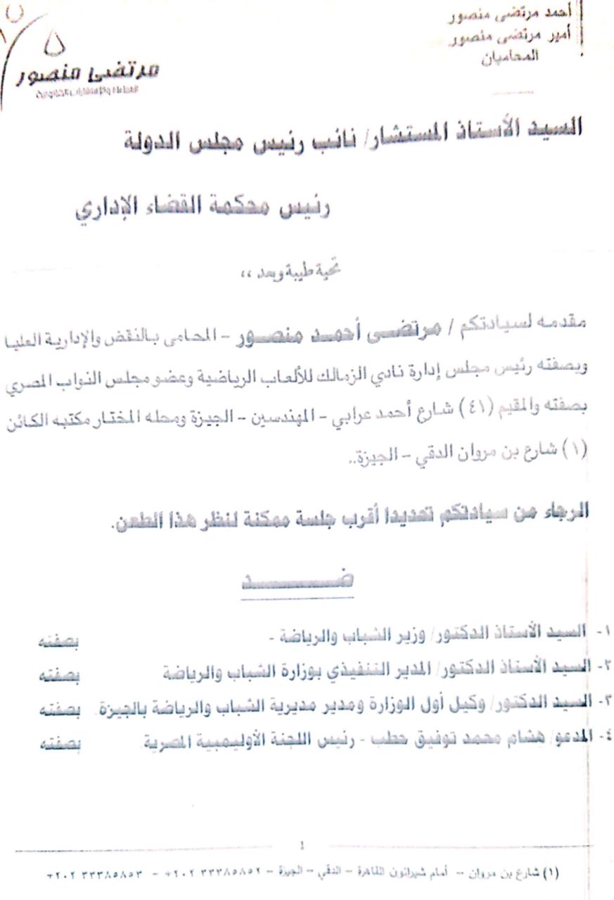 أقام مرتضي منصور رئيس نادي الزمالك دعوى قضائية امام محكمة القضاء الاداري بمجلس الدولة، يطالب فيها بوقف القرار الصادر من اللجنة الاولمبية المصرية، والزمت فيه اللجنة الأوليمبية المصرية، إدارة نادي الزمالك بالدعوة لجمعية عمومية لانتخاب رئيس جديد للنادي، بدلاً من مرتضى منصور، الذي تم ايقافه عن مزاولة أي نشاط رياضي لمدة 4 سنوات.
