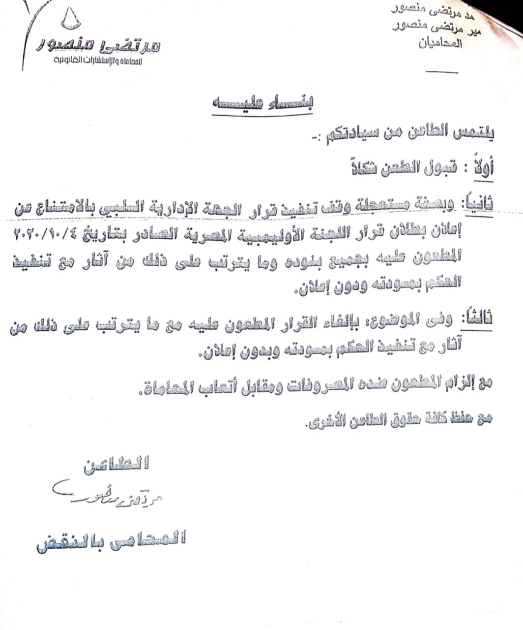 واختصمت الدعوى التي حملت رقم 2015 لسنة 75 قضائية، وزير الشباب والرياضة والمدير التنفيذي لوزارة الشباب والرياضة وهشام حطب رئيس اللجنة الاولمبية المصرية.