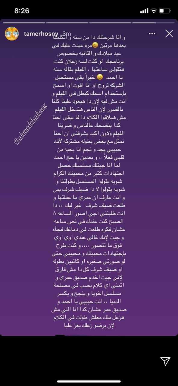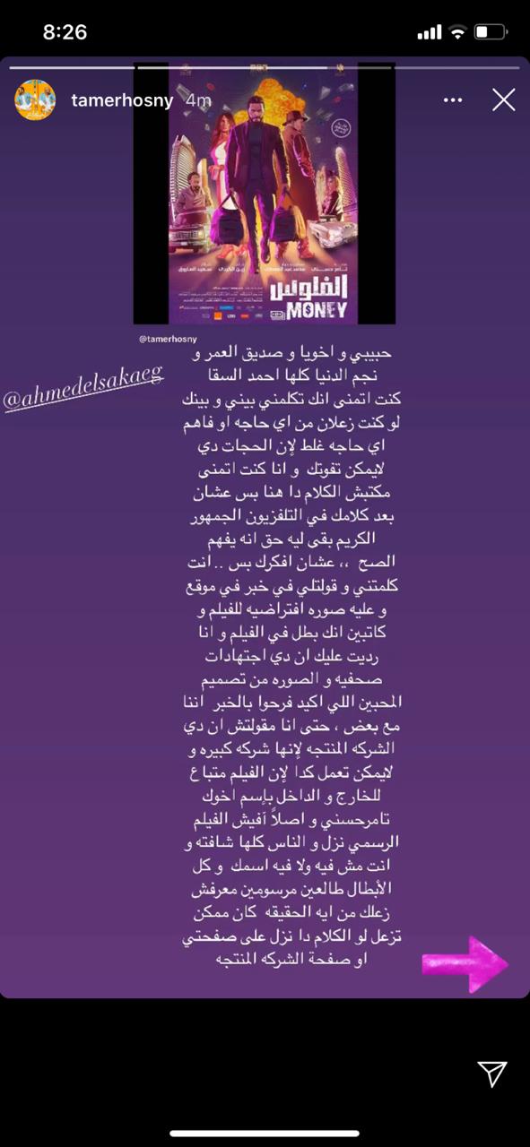 رد النجم تامر حسني على تصريحات النجم أحمد السقا بالأمس أثناء استضافة الأخير في برنامج "السيرة" مع الإعلامية وفاء الكيلاني حين عاتبه ووجه كلامه له بسبب موقف حصل بعدما حل كضيف شرف في فيلم "الفلوس" وكتابة اسم السقا كبطل للفيلم مع تامر مما سبب ضرر لـ أحمد السقا على حد قوله، ورغم مطالبة تامر بالتدخل إلا أنه فوت الأمر، مما دفع تامر حسني للرد على كل ما سبق من خلال ستوري عبر حسابه الرسمي على موقع انستجرام.