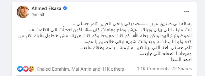 أحمد السقا لـ تامر حسنى:”أخطأت إنى أتكلمت على الهوا حقك عليا ماتزعلش”