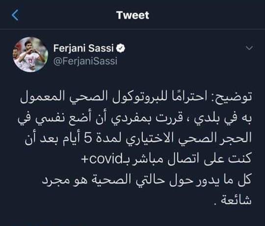 أعلن التونسى فرجانى ساسى، لاعب وسط الزمالك، خضوعه للحجر الصحى الاختيارى لمدة 5 أيام، فى تونس، وذلك بعدما اختلط بحالة إيجابية بفيروس كورونا أثناء وجوده فى معسكر منتخب بلاده، حيث كتب ساسى عبر حسابه الرسمى بموقع التواصل الاجتماعى تويتر: "توضح.. احترامًا للبروتوكول الصحى المعمول به فى بلادي، قررت بمفردى أن أضع نفسى فى الحجر الصحى الاختيارى لمدة 5 أيام، بعد أن كنت على اتصال مباشر بـ+covid كل ما يدور حول حالتى الصحية هو مجرد شائعة".