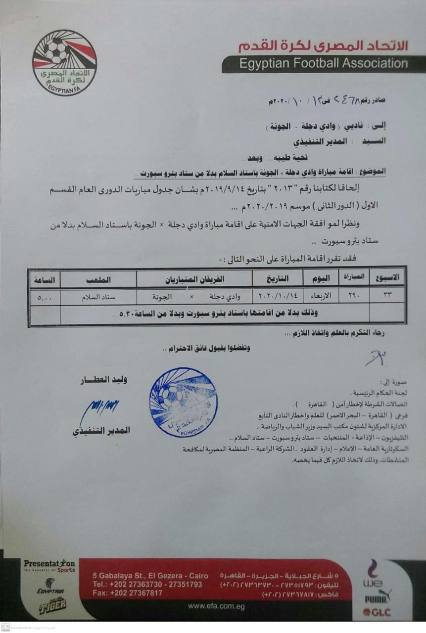 قررت لجنة المسابقات باتحاد الكرة تعديل موعد وملعب مباراة وادى دجلة والجونة فى الأسبوع الـ33 بالدورى العام، والتى من المقرر إقامتها غدا الأربعاء، حيث أخطرت لجنة المسابقات الناديين بنقل المباراة إلى استاد السلام بدلا من استاد بتروسبورت، على أن تقام فى الخامسة مساء بدلا من الخامسة والنصف مساء.