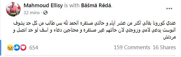 أعلن الفنان محمود الليثي إصابته بفيروس كورونا منذ 10 أيام، مؤكدا أن حالته حاليا مستقرة، إلا أن زوجته ووالدته حالتهم سيئة مطالبا بالدعاء لهما، وكتب عبر حسابه بموقع "فيس بوك" :"عندي كورونا بقالي اكتر من عشر ايام و حالتي مستقره الحمد لله بس طالب من كل حد يشوف البوست يدعي لامي وزوجتي لان حالتهم غير مستقرة و محتاجين دعاء و اسف لو حد اتصل و مردتش".
