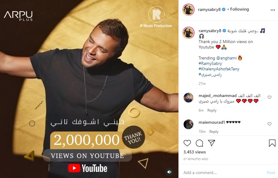 احتفل الفنان رامى صبرى، بتخطى أغنيته الجديدة " خلينى اشوفك تانى" حاجز 2 مليون مشاهدة على يوتيوب، حيث نشر مقطع من الأغنية عبر حسابه على انستجرام، موجها الشكر لكل جمهوره و متابعيها قائلا:" شكرا لـ 2 مليون مشاهدة ".