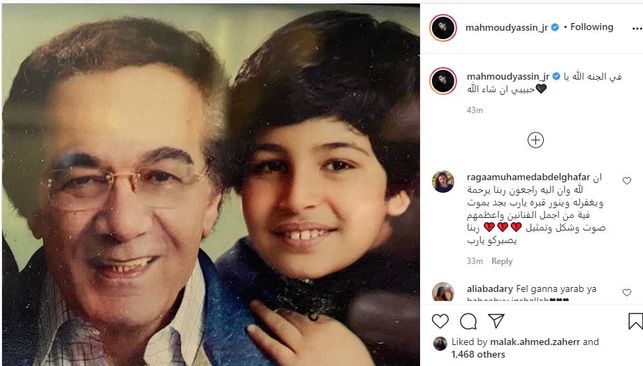 شارك محمود عمرو ياسين، حفيد الفنان الراحل محمود ياسين، متابعيه عبر حسابه الرسمي على موقع التواصل الاجتماعي "إنستجرام" بصورة نادرة تجمعه بالفنان الراحل محمود ياسين، معلقا عليها: "في الجنة الله يا حبيبي إن شاء الله".
