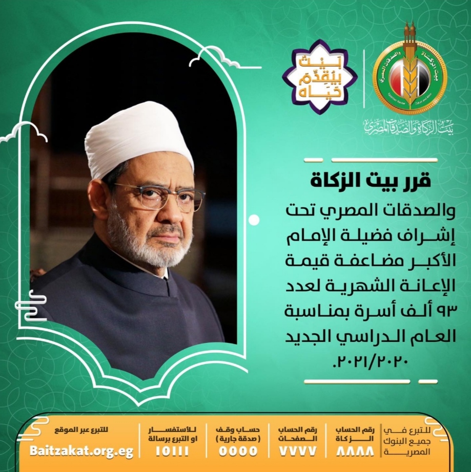 أعلن بيت الزكاة والصدقات المصري، تحت إشراف فضيلة الإمام الأكبر الدكتور أحمد الطيب، شيخ الأزهر، عن مضاعفة قيمة الإعانة الشهرية الممنوحة لمستحقي الزكاة لعدد 93 ألف أسرة خلال شهر أكتوبر فقط، وذلك بمناسبة العام الدراسي الجديد 2020- 2021.