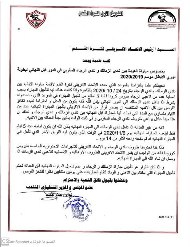 كشف مرتضى منصور رئيس نادى الزمالك عن الخطاب الذى تم ارساله رسميا إلى الاتحاد الأفريقي لكرة القدم الكاف أمس الأربعاء والذي أكد خلاله أنه متمسك بإقامه مباراة العودة للدور نصف نهائى دوري أبطال أفريقيا في موعدها يوم ٢٤ أكتوبر وأنه في حال وجود نية لتأجيلها بسبب وجود حالات إصابة كورونا بين صفوف الرجاء المغربي فإنه لا يمانع في التأجيل بشرط أنه في حال وصول فريق الزمالك إلى الدور النهائى يتم تأجيل موعده بنفس عدد الأيام التي تم تأجيل لقاء الاياب فيها تحقيقا لمبدا تكافؤ الفرص خصوصا أن الزمالك راعي ظروف الرجاء.