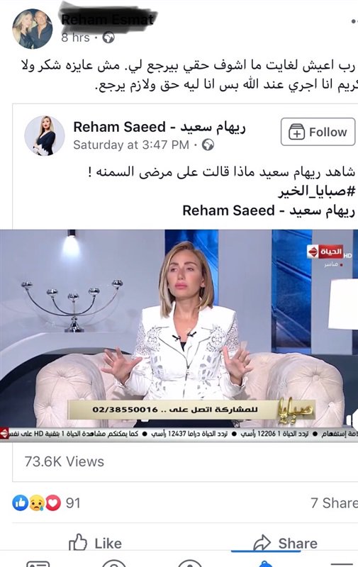 كتبت الإعلامية ريهام سعيد ، عبر حسابها الشخصي على موقع التواصل الاجتماعي "فيسبوك " منشورا بعد اعتزالها الإعلام وتوقف برنامجها صبايا الخير، نتيجة تصريحاتها الاخيرة عن مرضى السمنة.