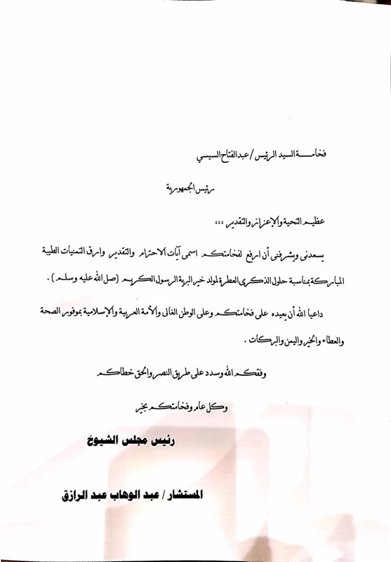 أرسل المستشار عبدالوهاب عبدالرازق، رئيس مجلس الشيوخ، برقية تهنئة للرئيس عبدالفتاح السيسي، بمناسبة المولد النبوي الشريف.