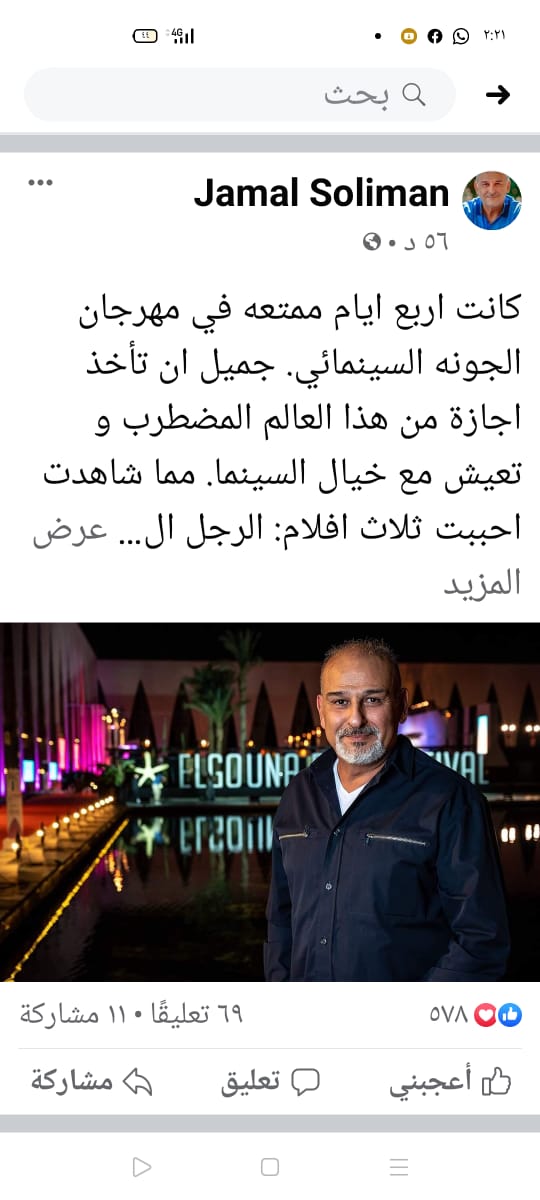 نشر النجم السورى جمال سليمان على صفحته الخاصة على موقع التواصل الاجتماعي فيس بوك كلمات تحدث فيها عن شعوره وانطباعه عن مهرجان الجونة السينمائى، قائلا: "كانت أربع أيام ممتعة في مهرجان الجونة السينمائى، جميل أن تأخذ إجازة من هذا العالم المضطرب، وتعيش مع خيال السينما".