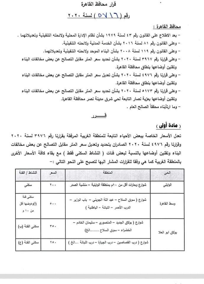 أصدر اللواء خالد عبد العال محافظ القاهرة القرار رقم ٥٤١٦ لسنة ٢٠٢٠ بتخفيض قيمة سعر المتر في مخالفات البناء فى بعض أحياء العاصمة بالنسبة لبعض الفئات خاصة فى الأحياء متوسطة الدخل مراعاة للبعد الإجتماعى مع بقاء كافة الأسعار الأخرى تيسيرا على المواطنين المتقدمين للتصالح مع مراعاة خصم نفس النسبة لمن سددوا جدية التصالح في الفترة السابقة.