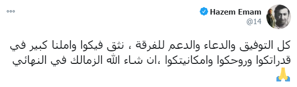 حرص الثعلب الصغير حازم إمام، نجم نادى الزمالك ومنتخب مصر الأسبق، على دعم فريق الكرة بنادى الزمالك، قبل لقاءه الهام والمرتقب، أمام الرجاء البيضاوى المغربى، فى إياب دور نصف النهائى لبطولة دورى أبطال إفريقيا، المقرر لعبها مساء اليوم، على أرضية إستاد القاهرة الدولى، حيث كتب عبر حسابه على تويتر: "كل التوفيق والدعاء والدعم للفرقة، نثق فيكم وأملنا كبير فى قدراتكم وروحكم وامكانيتكم، إن شاء الله الزمالك فى النهائى".