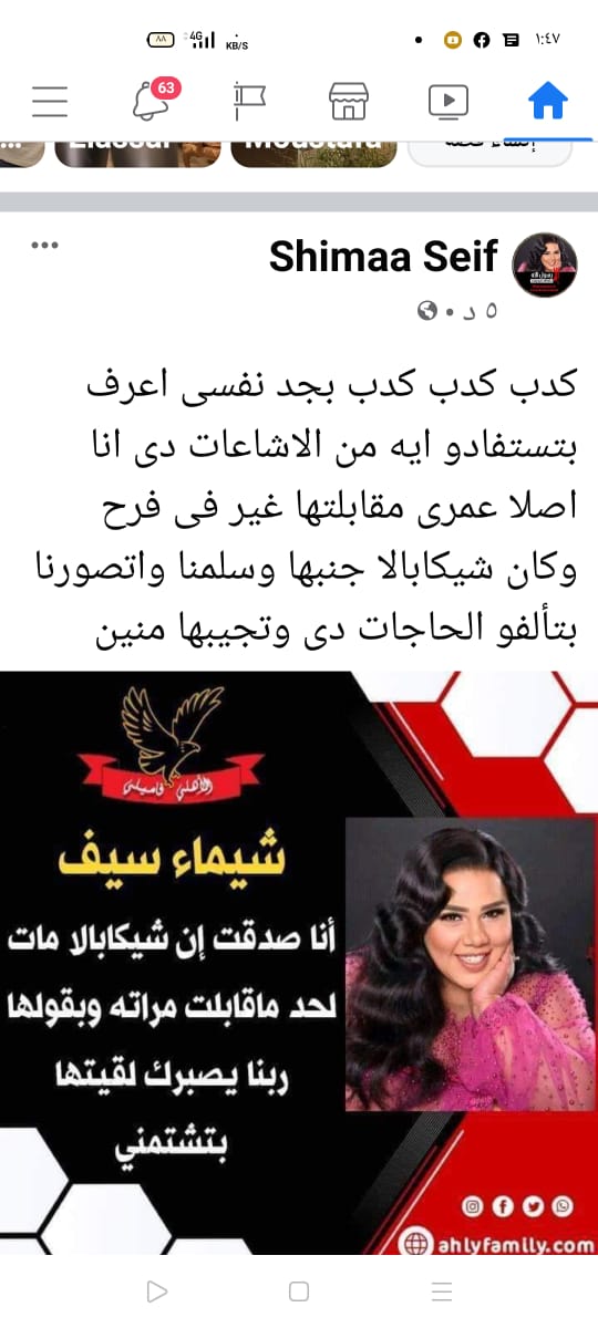 أعربت الفنانة شيماء سيف عن غضبها إزاء ما نشر على بعض مواقع التواصل حول تصريح لها يقول إنها صدقت أن شيكابالا مات وحينما قابلت زوجته قالت لها ربنا يصبرك لقيتها بتشتمنى"، وعلقت على ذلك على صفحتها بموقع التواصل الاجتماعى فيس بوك قائلة: "كدب كدب كدب بجد نفسى اعرف بتستفادو ايه من الاشاعات دى انا اصلا عمرى مقابلتها غير فى فرح وكان شيكابالا جنبها وسلمنا واتصورنا بتألفوا الحاجات دى وتجيبها منين".
