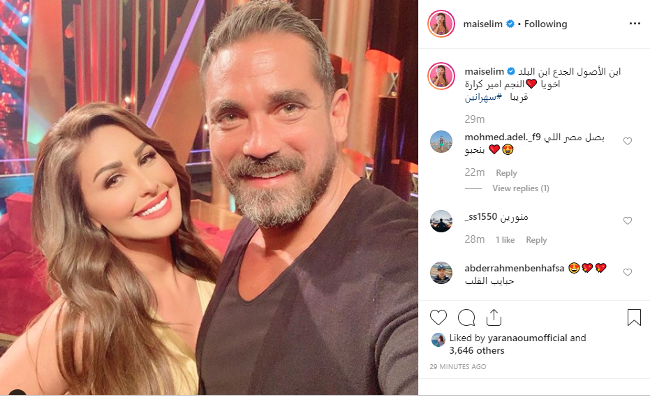 وكتبت:"ابن الأصول الجدع ابن البلد اخويا النجم امير كرارة قريبًا "سهرانين".