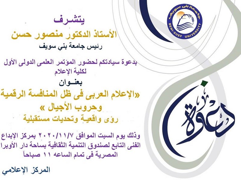 وجهت كلية الإعلام جامعة بني سويف الدعوة الي السيد الأستاذ محمد عبد المنصف رئيس تحرير البوابة المصرية، للمشاركة في المؤتمر الأول للكلية يوم السبت القادم، حيث يعقد المؤتمر تحت شعار الاعلام العربي في ظل المنافسة الرقمية رؤي واقعية وحروب مستقبلية.