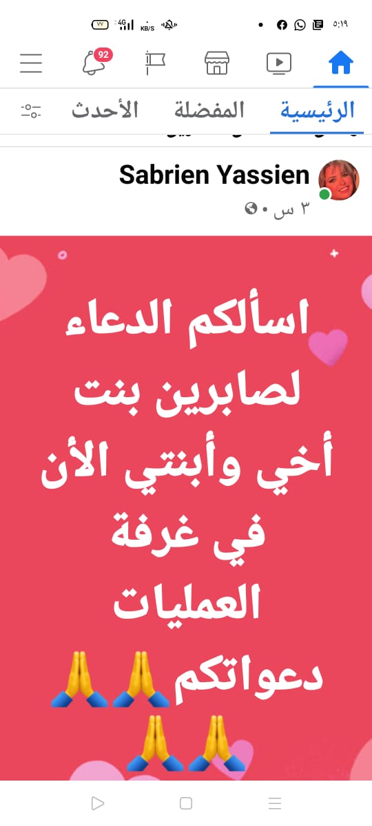 نشرت النجمة صابرين علي صفحتها الرسمية بموقع التواصل الاجتماعي فيس بوك بوست تطلب فيه من أصدقائها ومتابعيها الدعاء بالشفاء لابنة أخيها صابرين بالشفاء التى تجرى عملية جراحية الآن.