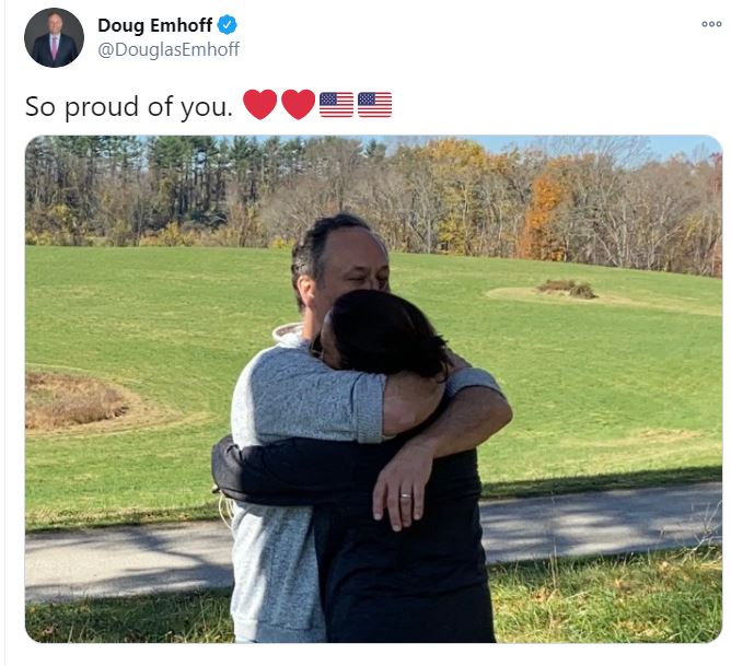 احتفل دوج إمهوف، زوج السيناتور الأمريكية كامالا هاريس، بفوزها بمنصب نائب الرئيس في الانتخابات الرئاسية الأمريكية مع الرئيس المنتخب جو بايدن، حيث نشر عبر حسابه الرسمي على تويتر، صورة وهو يعانق زوجته كامالا معلقا: "أنا فخور جدا بك".
