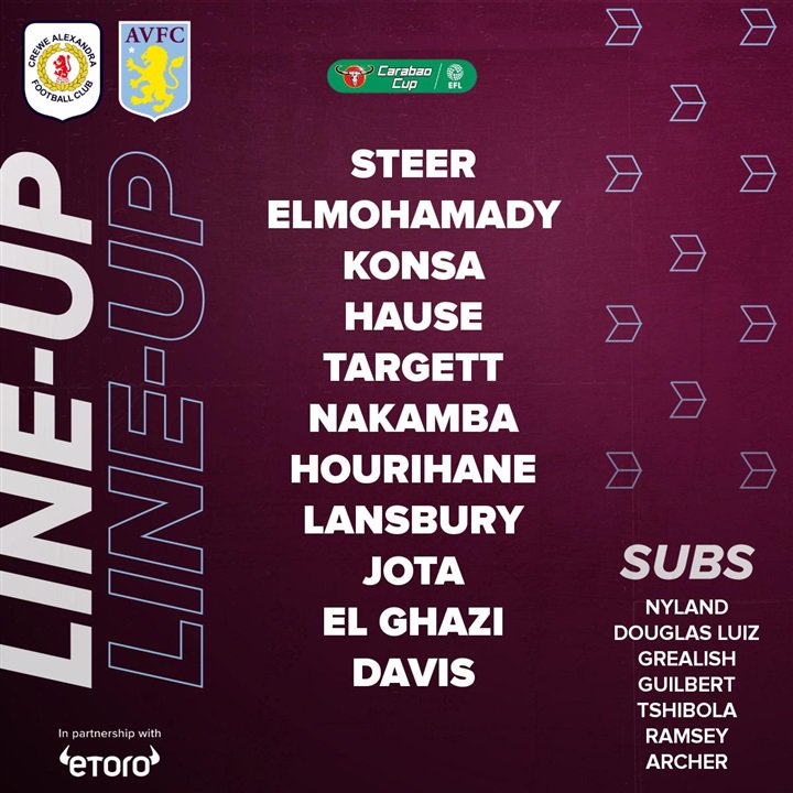 أعلن ديان سميث المدير الفنى لفريق أستون فيلا الذي يلعب ضمن صفوفه أحمد المحمدى ومحمود تريزيجيه،عن تشكيل فريقه الذى أمام كرو ألكساندرا على أرضية ملعب "ألكساندرا ستاديوم"، ضمن منافسات الدور الثانى فى بطولة كأس الرابطة الإنجليزية.