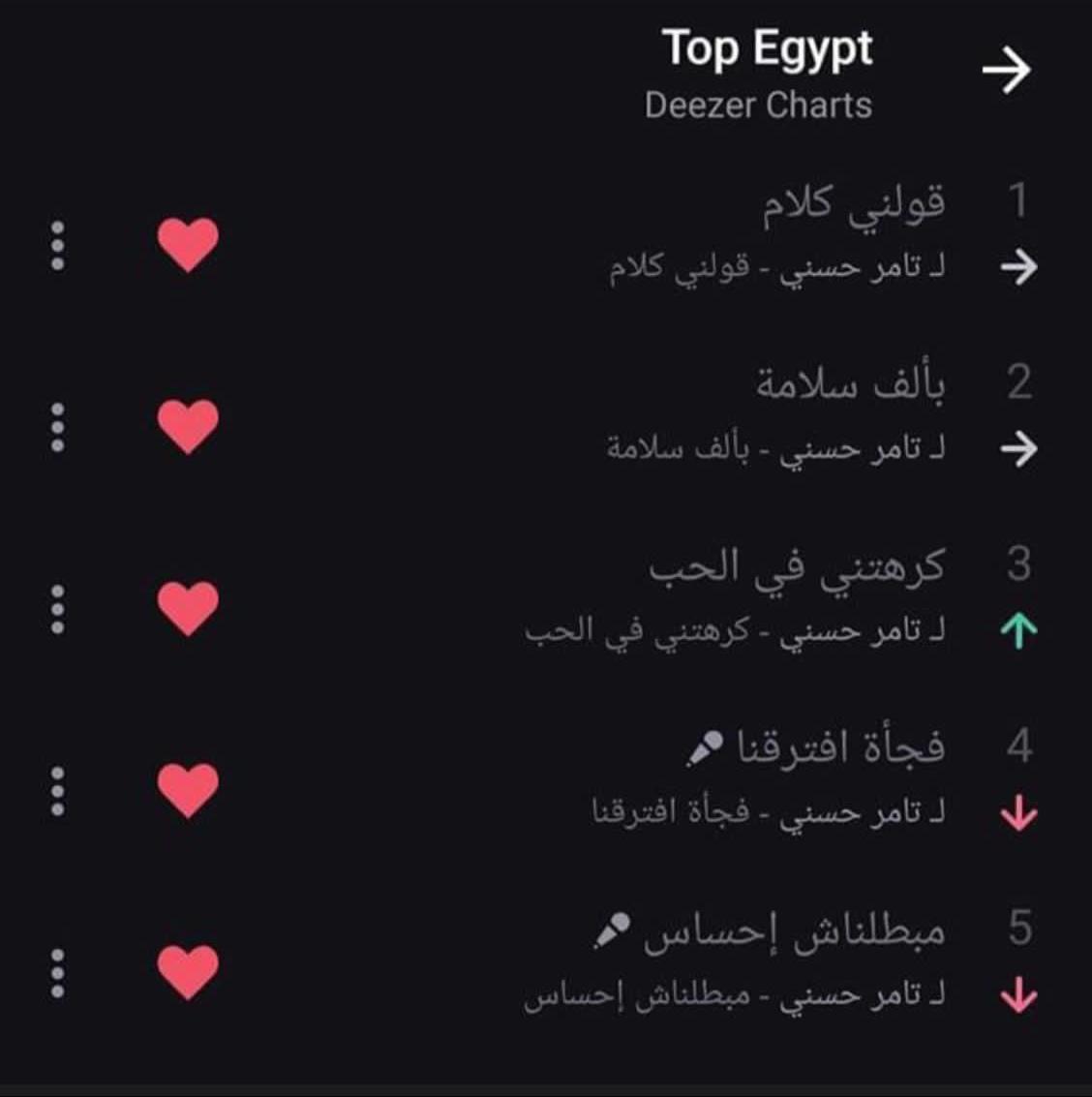 الأمر لم يقف عند هذا الحد، وإنما استمر حتي ظهر اليوم النجم تامر حسني متصدرًا بواسطة 5 أغاني دفعة واحدة أحد المنصات العربية الشهيرة، وجاء الترتيب كالآتي في المركز الأول: "قولني كلام، ثم بألف سلامة، كرهتنى في الحب، فجأة افترقنا، مبطلناش إحساس".