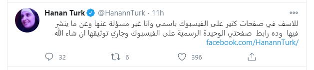 حذرت الفنانة المعتزلة حنان ترك، جمهورها ومتابعيها بسبب الصفحات المزيفة التي تحمل اسمها وتنسب لها على موقع التواصل الاجتماعى فيس بوك، وغردت حنان ترك، عبر حسابها على تويتر، قائلة: "للأسف في صفحات كتير على فيس بوك باسمي، وأنا غير مسئولة عنها، وعن ما ينشر فيها، وده رابط صفحتي الوحيدة الرسمية على الفيسبوك وجاري توثيقها إن شاء الله".