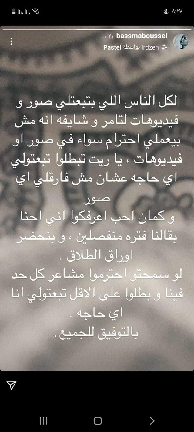 وكتبت بسمة عبر خاصية "ستوري" على حسابها الرسمي على موقع الصور "إنستجرام" : "لكل الناس اللي بتبعتلي صور وفيديوهات لتامر وشايفة إنه مش بيعملي احترام سواء في صور أو فيديوهات، ياريت تبطلوا تبعتولي أي حاجة عشان مش فارقلي أي صور".
