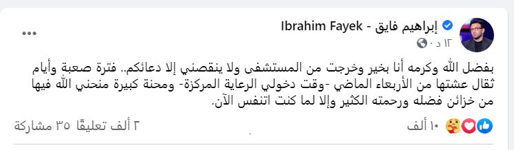 خرج الإعلامي إبراهيم فايق من المستشفى بعد تلقيه العلاج إثر تعرضه لوعكة صحية الأسبوع الماضي، وكتب عبر حسابه الرسمي على "فيس بوك" مساء اليوم: "بفضل الله وكرمه أنا بخير وخرجت من المستشفى ولا ينقصني إلا دعائكم.. فترة صعبة وأيام ثقال عشتها من الأربعاء الماضي -وقت دخولي الرعاية المركزة- ومحنة كبيرة منحني الله فيها من خزائن فضله ورحمته الكثير وإلا لما كنت أتنفس الآن".