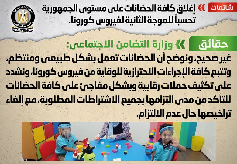 انتشر في بعض المواقع الإلكترونية وصفحات التواصل الاجتماعي أنباء بشأن إغلاق كافة الحضانات على مستوى الجمهورية تحسباً للموجة الثانية لفيروس كورونا، وقد قام المركز الإعلامي لمجلس الوزراء بالتواصل مع وزارة التضامن الاجتماعي، والتي نفت تلك الأنباء، مُؤكدةً أنه لا صحة لإغلاق كافة الحضانات على مستوى الجمهورية، مُوضحةً أن الحضانات تعمل بشكل طبيعي ومنتظم، وتتبع كافة الإجراءات الاحترازية للوقاية من فيروس كورونا، مُشددةً على تكثيف حملات رقابية وبشكل مفاجئ على كافة الحضانات للتأكد من مدى التزامها بجميع الاشتراطات المطلوبة، مع إلغاء تراخيصها حال عدم الالتزام.