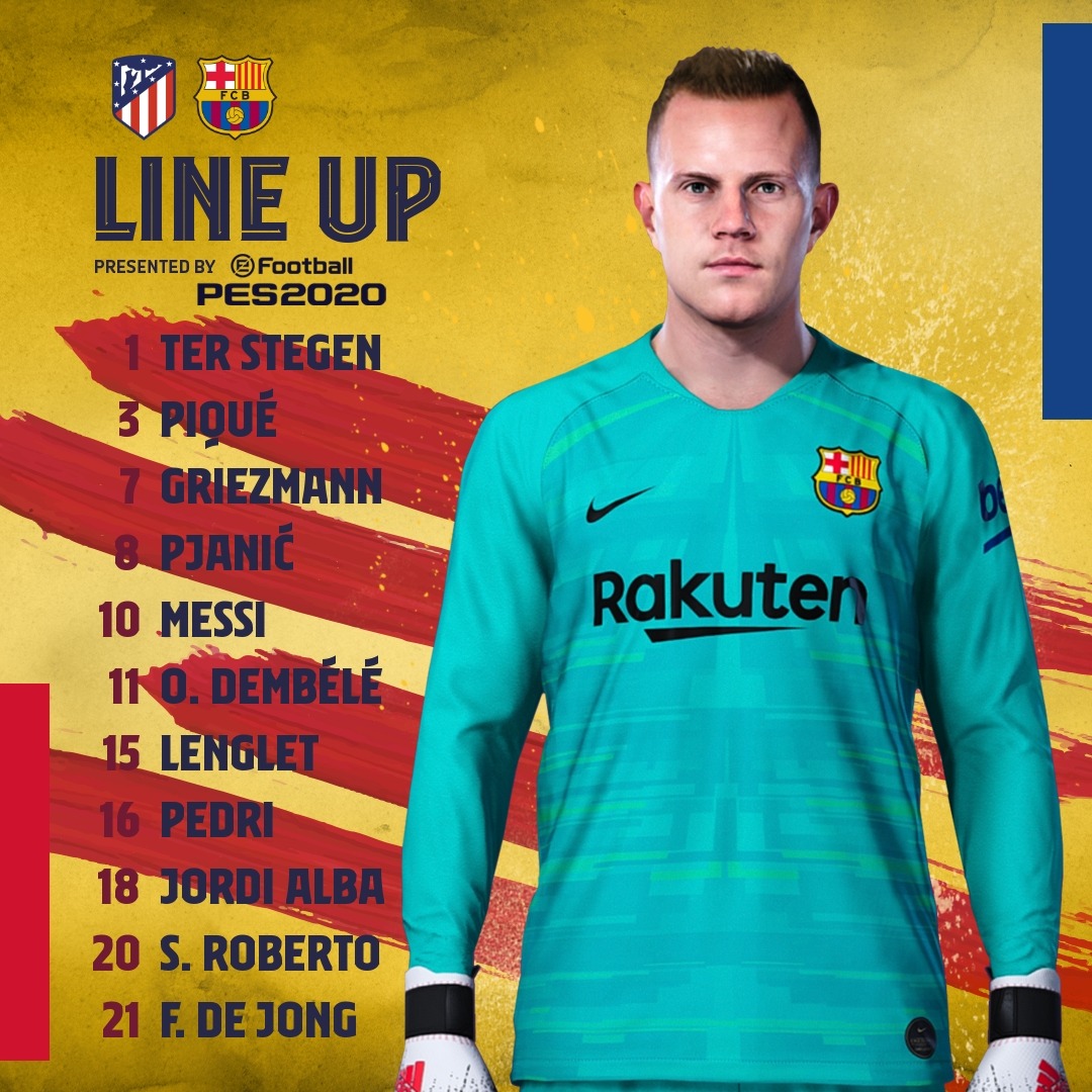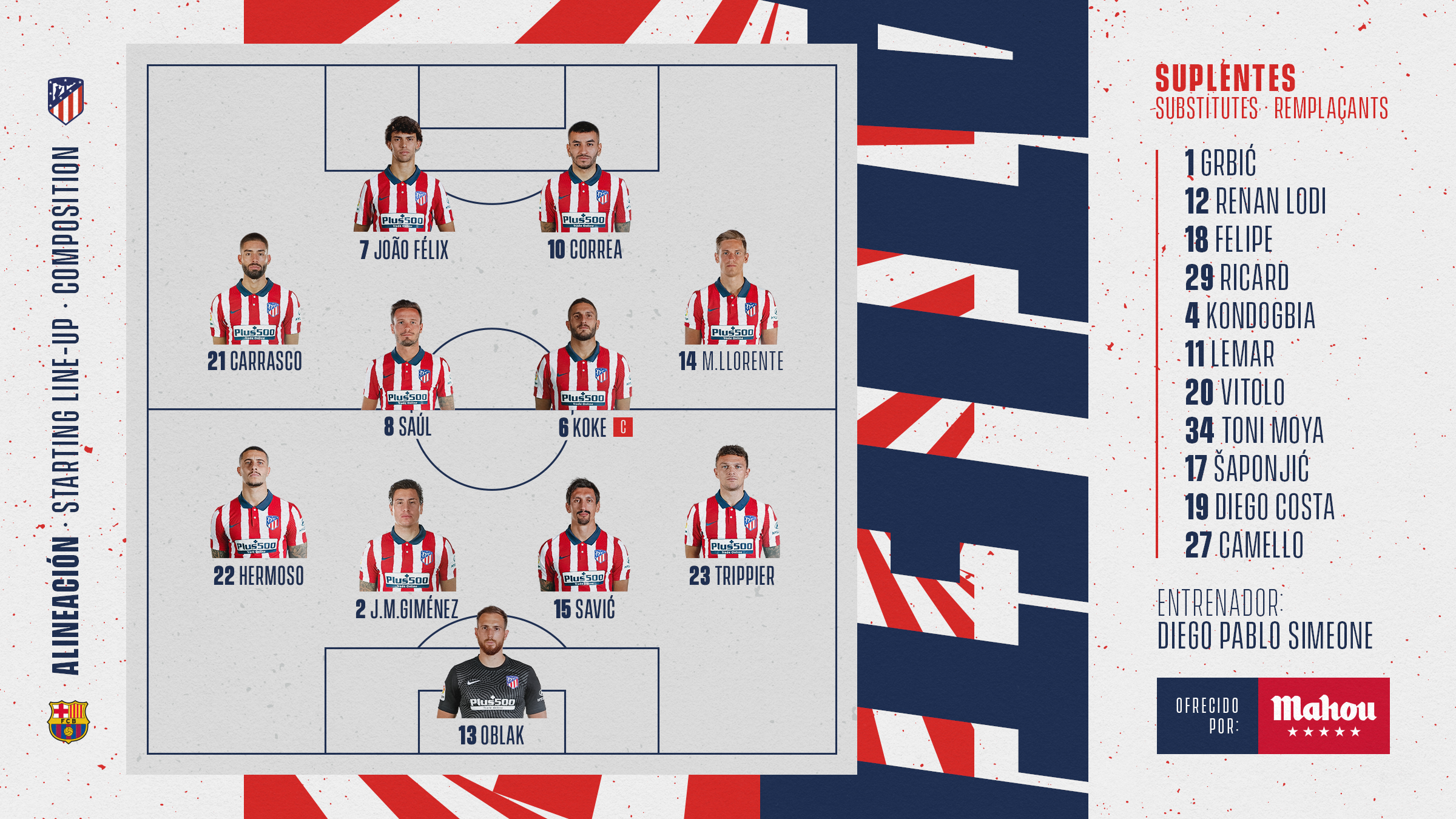 وجاء تشكيل أتلتيكو مدريد ضد برشلونة كالتالى.. حراسة المرمى: يان أوبلاك خط الدفاع: خيمينيز، سافيتش، تريبير، هيرموسو خط الوسط: ساؤول نيجويز، كاراسكو، لورينتى، كوكى خط الهجوم: آنخيل كوريا، جواو فيليكس.
