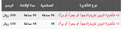 ـ تأشيرة المرور للزيارة، جوا، أو بحرا، أو برا، وصلاحيتها 96 ساعة، ومدة الإقامة 96 ساعة، الرسم الخاص بها 300 ريال.