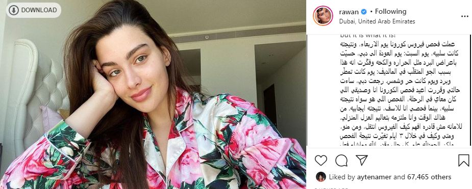 وتابعت :"رجعت دبي، ساءت حالتي وقررت اعيد فحص الكورونا انا وصديقي اللي كان معاي في الرحلة، الفحص اللي هو سواه نتيجته سلبيه، بينما فحصي انا للاسف، نتيجته ايجابيه. من هذاك الوقت وانا ملتزمه بتعاليم العزل المنزلي. للامانه مش قادره افهم كيف الفيروس انتقل، ومن منو، ومتى وكيف في خلال ٣ ايام تغيّرت نتيجة الفحص ولكن الحمدلله على كل حال وقدر الله وماشاء فعل".