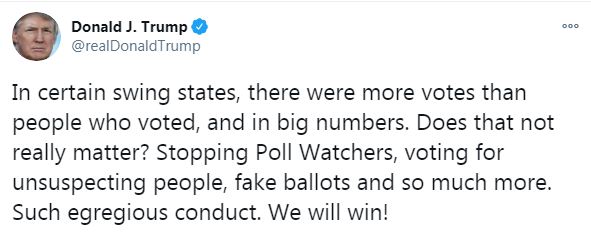 أكد الرئيس الامريكي المنتهية ولايته دونالد ترامب، أن هناك بعض الولايات التي شهدت منافسة في الانتخابات الامريكية يوجد بها أصوات أكثر من الذين صوتوا، وغرد ترامب على حسابه الرسمي بموقع "تويتر"، قائلا: "في بعض الولايات المتأرجحة، كانت هناك أصوات أكثر من الأشخاص الذين صوتوا، وبأعداد كبيرة.