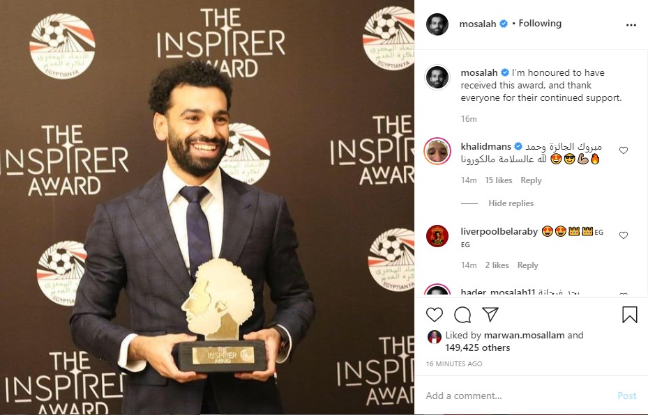 وجه النجم المصرى الشكر للاتحاد المصرى، بعد تكريمه قبل عدة أيام، ونشر صلاح صورة وعلق قائلا، "يشرفني حصولي على هذه الجائزة، وأشكر الجميع على دعمهم المستمر".