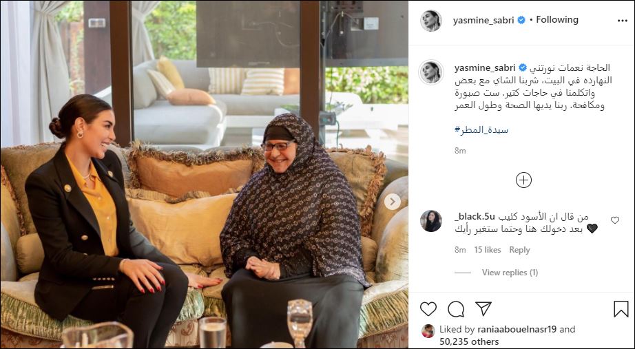 أعربت النجمة ياسمين صبرى، عن سعادتها للقائها مع الحاجة نعمات عبد الحميد المعروفة إعلامية بسيدة المطر، مشيرة إلى أنها سيدة صبورة ومكافحة، ونشرت ياسمين صبرى، عبر حسابها بموقع انستجرام، صور من لقاءها مع الحاجة نعمات، وعلقت قائلة:" الحاجة نعمات نورتني النهارده في البيت، شربنا الشاي مع بعض واتكلمنا في حاجات كتير.. ست صبورة ومكافحة.. ربنا يديها الصحة وطول العمر.