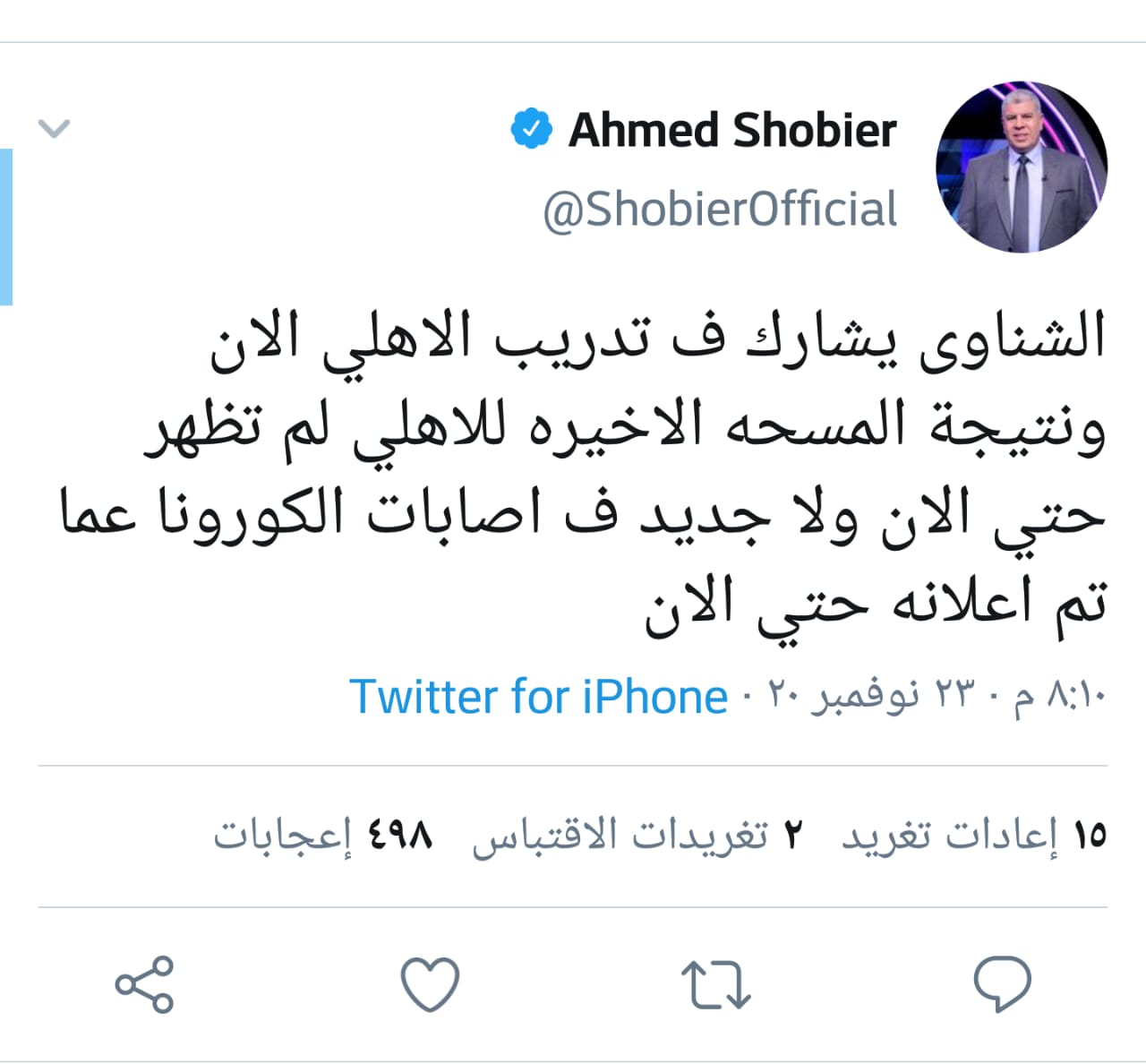 أكد الإعلامى أحمد شوبير، أن كل ما يتم تداوله بشأن إصابة محمد الشناوى حارس مرمى النادى الأهلى بكورونا حتى الآن، غير صحيح، وقال شوبير عبر صفحته الشخصية على تويتر: "الشناوى يشارك في تدريب الأهلي الآن ونتيجة المسحة الأخيرة للأهلي لم تظهر حتي الآن ولا جديد في إصابات الكورونا عما تم إعلانه حتي الآن".