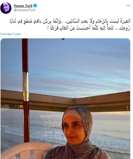 شاركت النجمة المعتزلة حنان ترك متابعيها عبر حسابها بموقع "تويتر" بصورة جديدة لها، بعد ترحيب الجمهور أمس بأحدث ظهور لها بعد غياب أكثر من عامين، منذ حذفها جميع صورها من حسابها بموقع "انستجرام" في أغسطس 2018، وظهرت حنان في الصور الجديدة تجلس وخلفها البحر، معلقة عليها :"العبرةُ لَيسَت بِالزِّحَام ولَا بعددِ السَّائلِين، ..وَإنَّمَا بِركن دافئٍ مُنطوٍ فِي ثَنايَا رُوحِك.... تَلجأُ إليهِ كلَّما أحسَستَ مِنَ العَالمِ فَزَعًا".