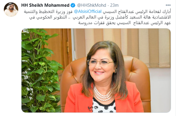 هنأ الشيخ محمد بن راشد، رئيس مجلس وزراء دولة الإمارات العربية المتحدة، حاكم دبى، الرئيس عبد الفتاح السيسى بمناسبة فوز وزيرة التخطيط والتنمية الاقتصادية هالة السعيد كأفضل وزيرة في العالم العربى، حيث غرد عبر تويتر، "أبارك لفخامة الرئيس عبدالفتاح السيسي فوز وزيرة التخطيط والتنمية الاقتصادية هالة السعيد كأفضل وزيرة في العالم العربي .. التطوير الحكومي في عهد الرئيس عبدالفتاح السيسي يحقق قفزات مدروسة".